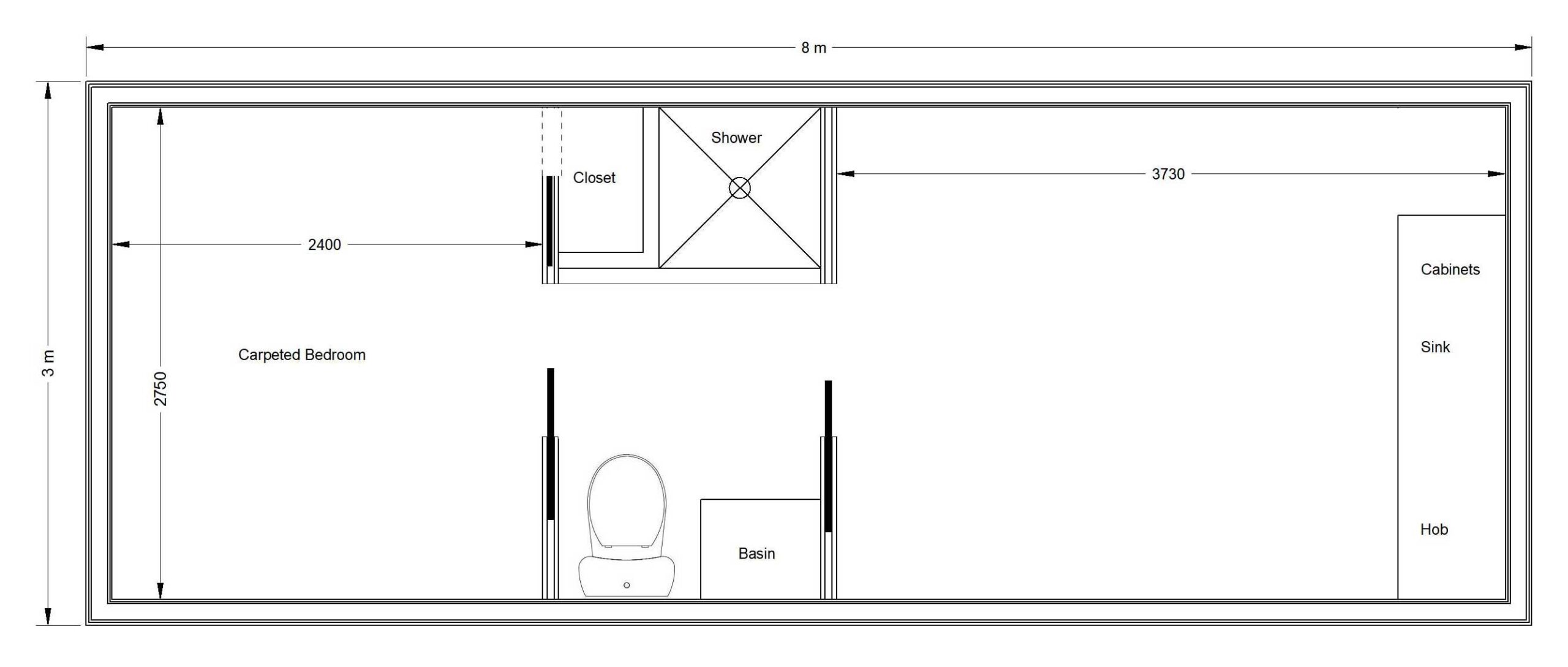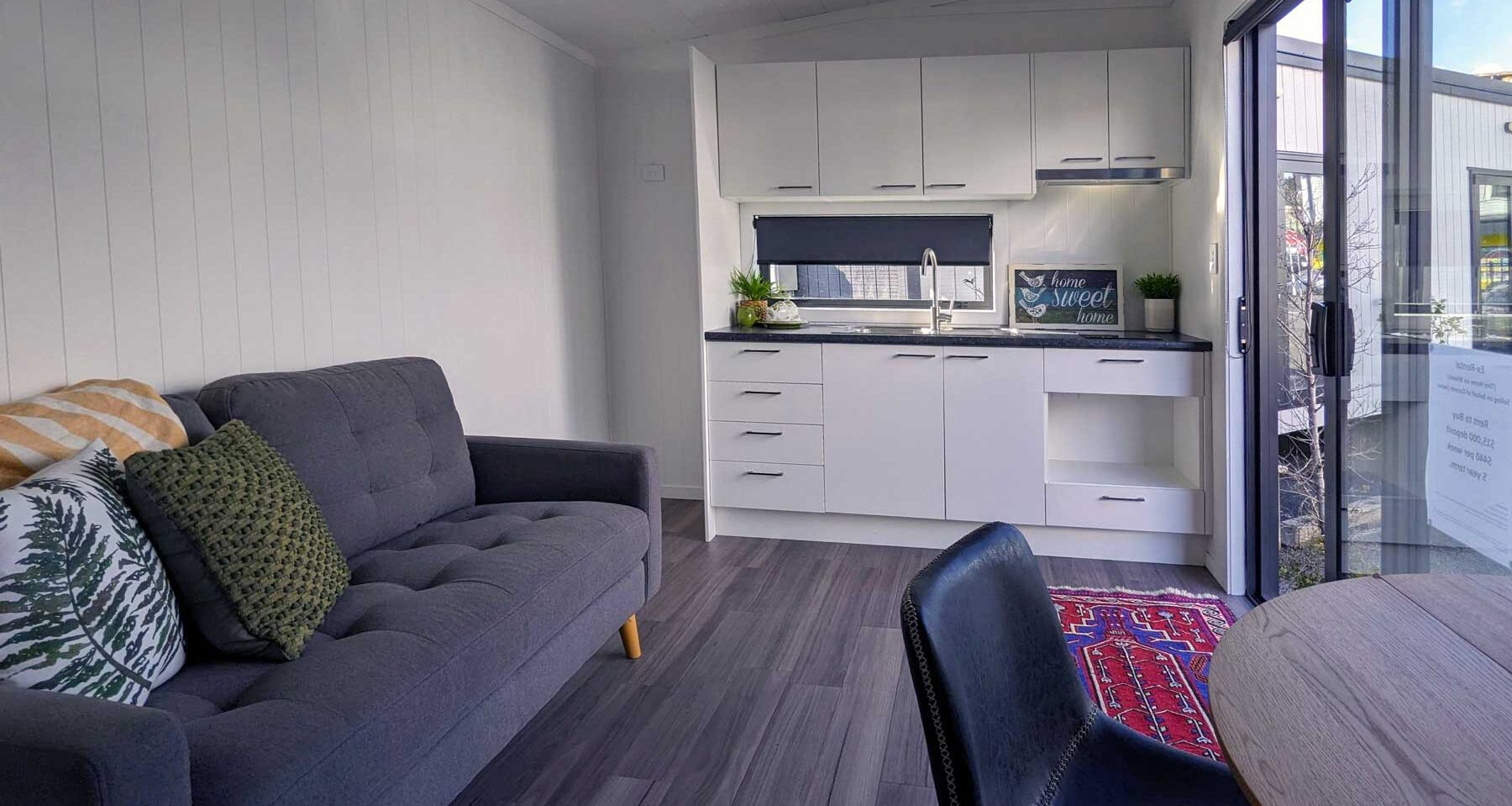 Kitchenette/lounge, bathroom and bedroom in a 8 x 3 mobile home ready to call home